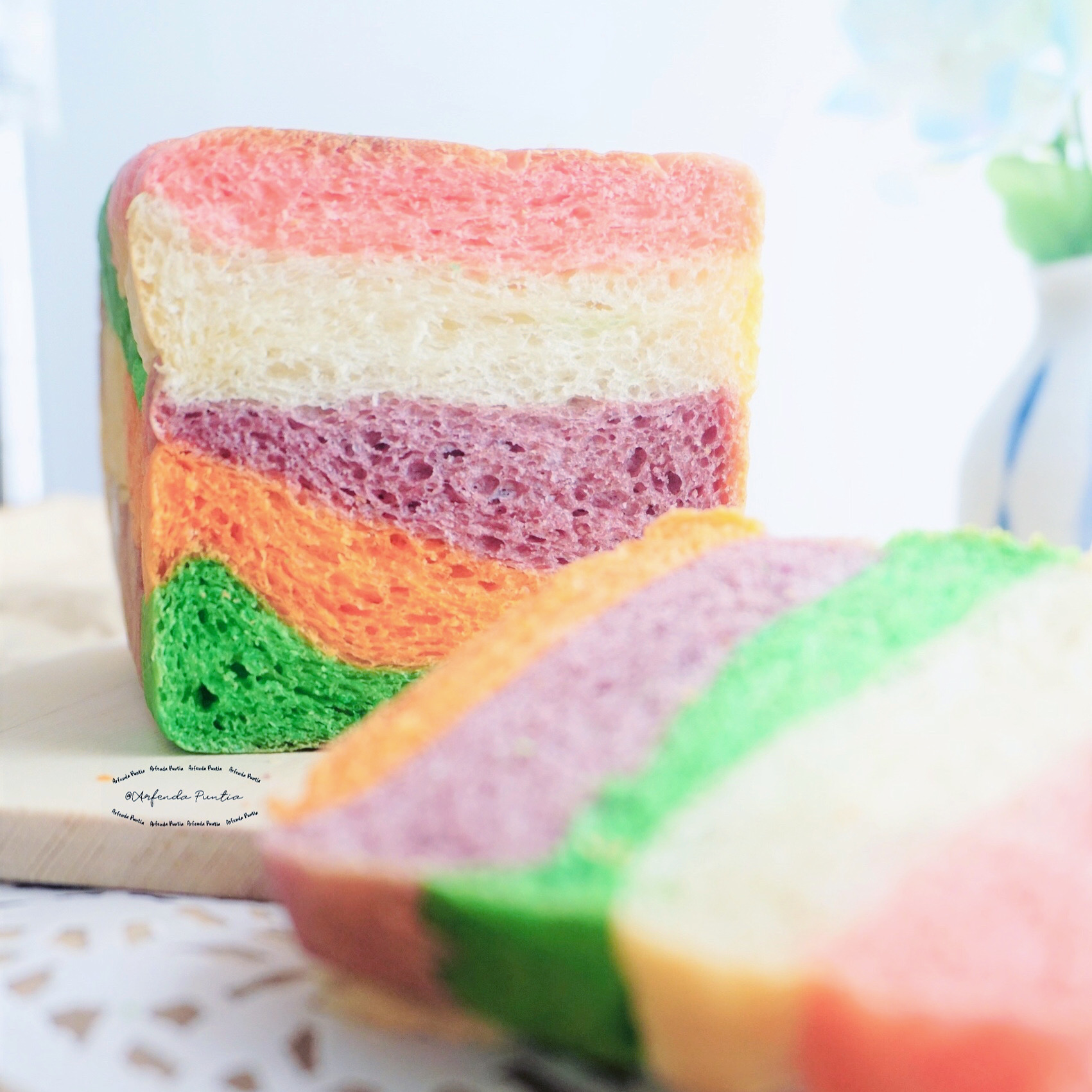 kalau mau bikin seperti ini setelah kalis, beri pewarna, atau untuk yg ungu saya pakai bubuk ubi ungu +air, uleni lagi hingga kalis lalu lanjut fermentasi pertama, dan setelah fermentasi 1, bagi masing masing adonan warna jadi 5 bagian, bulatkan, tata di loyang roti tawar.