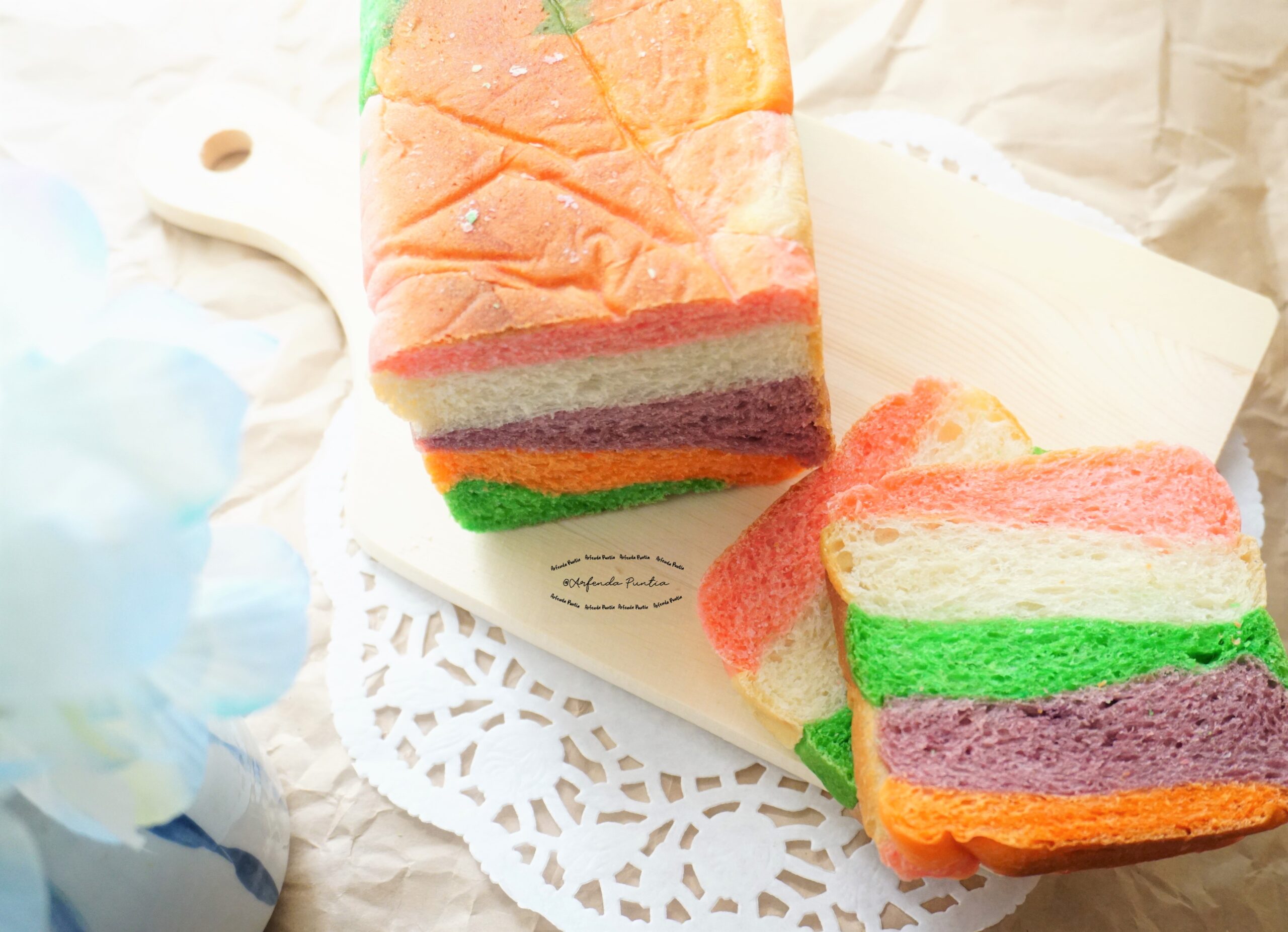 kalau mau bikin seperti ini setelah kalis, beri pewarna, atau untuk yg ungu saya pakai bubuk ubi ungu +air, uleni lagi hingga kalis lalu lanjut fermentasi pertama, dan setelah fermentasi 1, bagi masing masing adonan warna jadi 5 bagian, bulatkan, tata di loyang roti tawar.